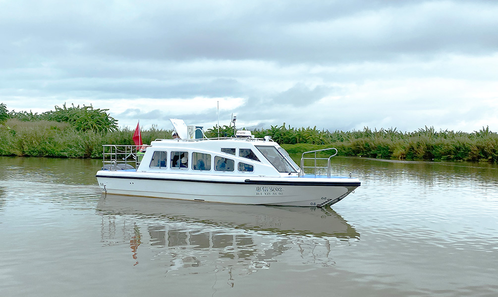 This boat is suitable for sightseeing, leisure and entertainment activities; the boat is equipped with facilities such as fresh water tanks, wash basins, salons, and simple toilets; the steel frame is reinforced inside, and the cabin is spacious and bright, which can be used for transportation and reception tasks. The hull of the boat is in the form of double floating bodies, the floating body is of round bottom type, and the side of the ship is equipped with hemming, which is stable and comfortable to ride. There is a hook bucket at the tail, and two outboard gasoline hooks are installed as propulsion power and used for steering.