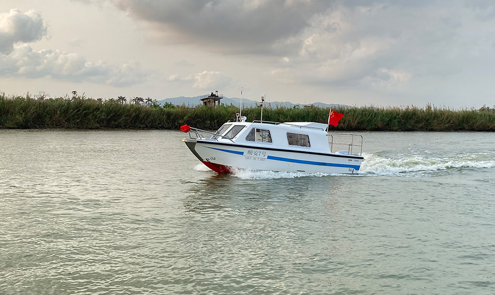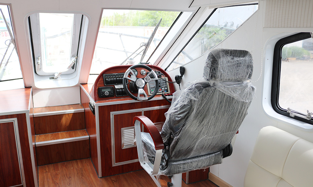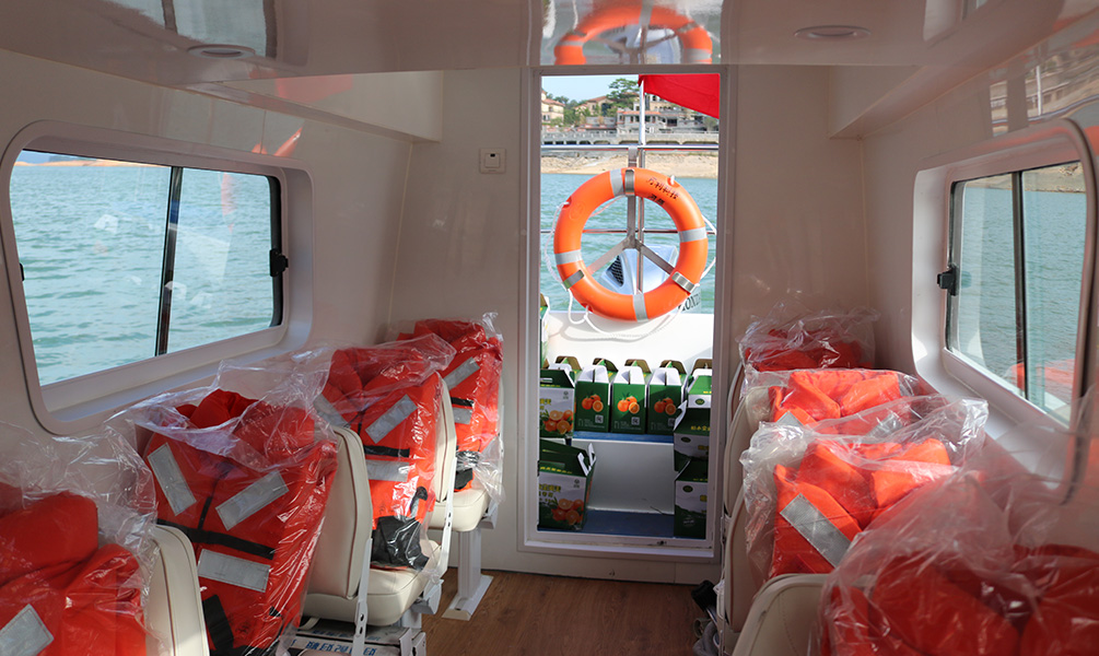 This boat is suitable for sightseeing, leisure and entertainment activities; the boat is equipped with facilities such as fresh water tanks, wash basins, salons, and simple toilets; the steel frame is reinforced inside, and the cabin is spacious and bright, which can be used for transportation and reception tasks. The hull of the boat is in the form of double floating bodies, the floating body is of round bottom type, and the side of the ship is equipped with hemming, which is stable and comfortable to ride. There is a hook bucket at the tail, and two outboard gasoline hooks are installed as propulsion power and used for steering.